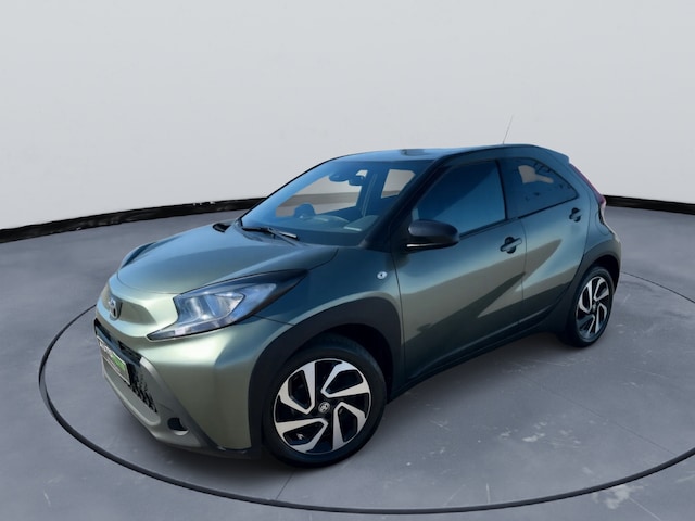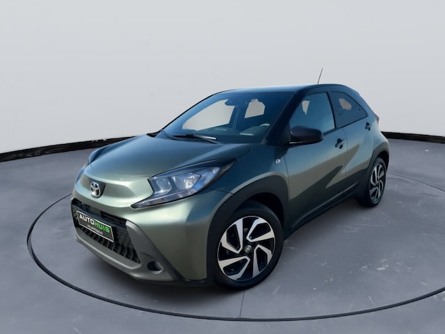 Nette en moderne Toyota Aygo X Pulse uit 2023, uitgevoerd in de opvallende kleur Cardamon Green met zwart dak. Deze compacte en zuinige auto is voorzien van een comfortabele automatische transmissie (CVT) en is ideaal voor zowel stadsverkeer als langere ritten.