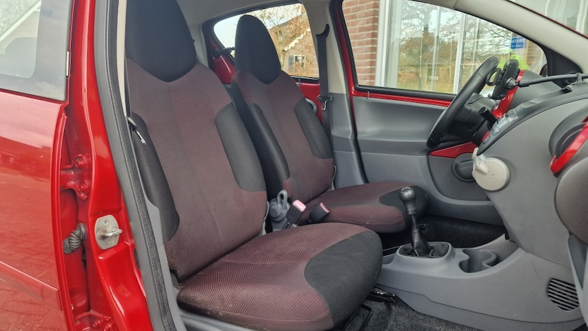 Toyota Aygo 1.0-12V Aspiration Red in de kleur Rood Metallic, Voorzien van de opties: Lichtmetalen velgen, Half lederen bekleding, Electrische ramen, Airco, Centrale deurvergrendeling, en nog veel meer! U bent van harte welkom. Op de voor en achter bumper laat de blanke lak wat los, technisch super wagen complete onderhoudshistorie is bekend.