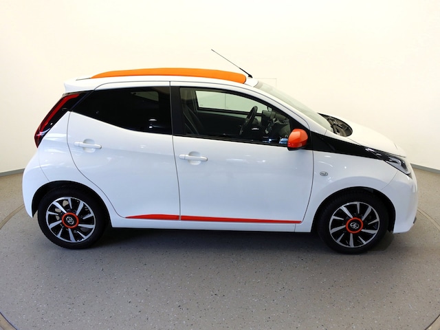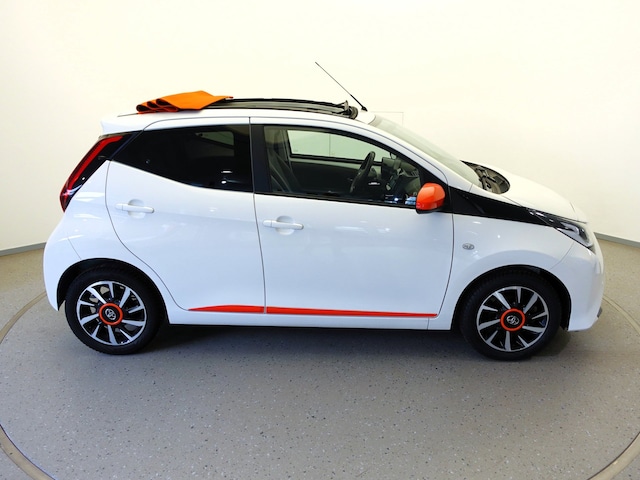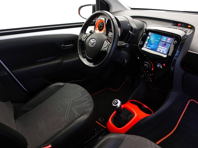Een erg mooie en sportief ogende TOYOTA AYGO Cabriotop met de 72pk sterke en toch zeer zuinige 1.0 VVT-i benzinemotor (gemiddeld verbruik van 1 ltr. op 27 km!) en een aantrekkelijk lage kilometerstand van slechts 72.000 km in de luxe "X-otic"-uitvoering met o.a.: airco, cruise control (LET OP! De meeste Aygo's zijn enkel en alleen uitgerust met speedlimiter!), af-fabriek ingebouwd 7-inch touchscreen "Smartphone Integration by Pioneer" multimedia-systeem met DAB+ radio/MP3-speler, Apple CarPlay® & Android Auto™, handsfree Bluetooth telefoonkoppeling en AUX- & USB-input, in hoogte verstelbare bestuurdersstoel, in hoogte verstelbaar multifunctioneel lederen stuurwiel, elektrisch bediend "Orange Twist" cabriodak, mistlampen in voorbumper, achteruitrijcamera, afstandsbediende centrale deurvergrendeling, elektrisch verstelbare en verwarmbare buitenspiegels, originele 15-inch lichtmetalen velgen met nagenoeg nieuwe All-Seasonbanden: VREDESTEIN QUATRAC, etc.