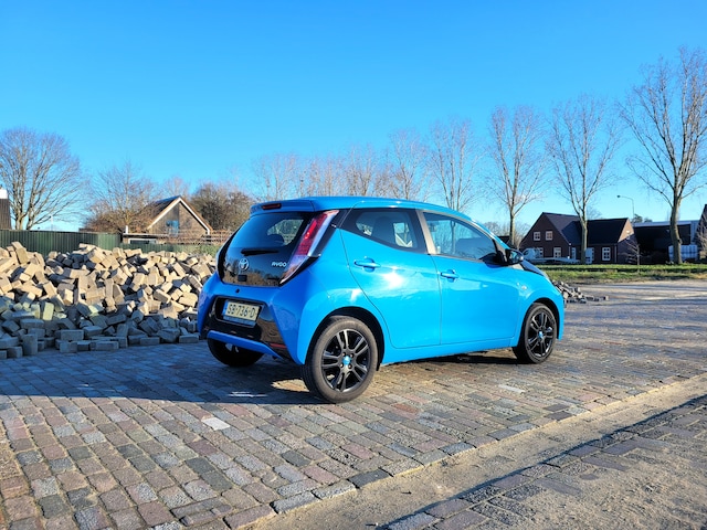 Deze Aygo valt lekker op met z’n opvallende blauwe kleur, die ook terugkomt in het interieur op het dashboard en de stoelen. De zwarte lichtmetalen velgen met blauwe naafkapjes maken het helemaal af.