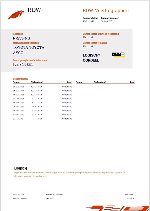 Met 102.744 kilometer op de teller is deze Aygo afkomstig van de eerste eigenaar en voorzien van een NAP-gecertificeerde kilometerstand, wat zorgt voor een betrouwbare en transparante historie. De soepele 1.0 VVT-i motor staat bekend om zijn lage verbruik en betrouwbare karakter, perfect voor zowel stadsritten als langere afstanden.