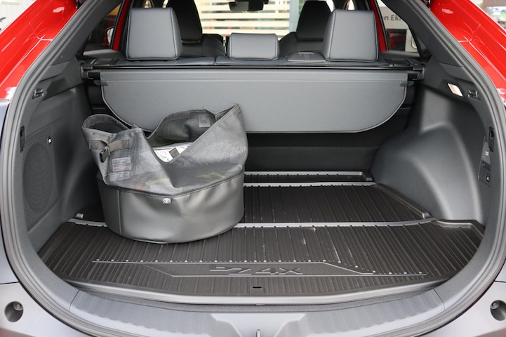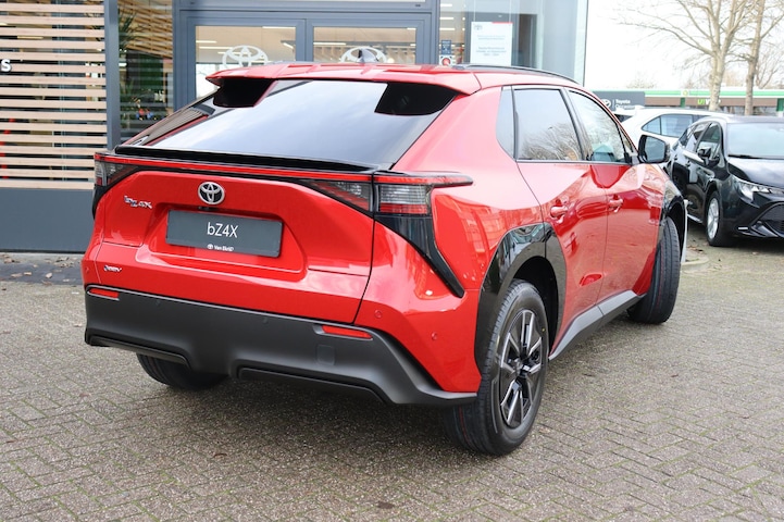 De bZ4X is in de kleur "Emotional Red" en is van alle gemakken voorzien.