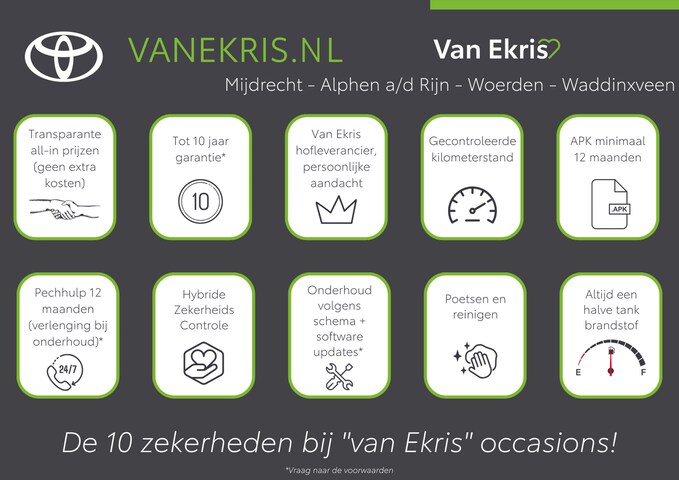 Interesse? Neem dan contact met ons op voor het maken van een afspraak. De getoonde prijs is incl. garantie en onderhoud t.w.v. € 599,-, hiervoor ontvangt u het volgende: Toyota garantie tot 10 jaar*, Volledige onderhoudsbeurt, geldige APK, registratie, volledige poetsbeurt en reiniging van het interieur, halve tank brandstof, pechhulp pas 24/7 Europa en pechhulp pas 24/7 Europa.