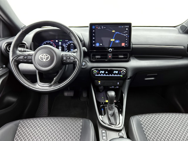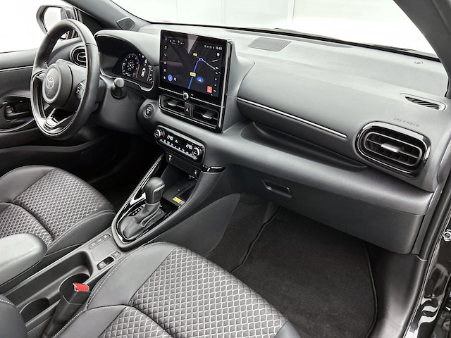 Met de achteruitrijcamera zie jij wat er achter de auto gebeurt. Zo rij je moeiteloos achteruit. Adaptive cruise control is een comfortabele en veilige optie. Het systeem reguleert de snelheid en houdt automatisch afstand tot jouw voorligger. Ingericht op Connected Services, voor een nog veiligere en comfortabelere rit. Ook praktisch: deze auto is voorzien van een eigen full map navigatiesysteem. Deze Toyota Yaris denkt vooruit als je van plan bent af te slaan. De kruisend verkeer detectie calculeert en analyseert het tegemoetkomende verkeer en waarschuwt als het risico op aanrijding bestaat. Wat je ook in deze auto kunt vinden zijn electronic climate control, draadloos opladen, DAB ontvangst, regensensor, keyless entry en buitentemperatuurmeter.