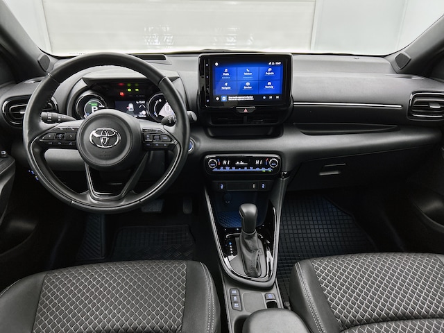 Rijfuncties worden glashelder en overzichtelijk weergegeven via het digitale dashboard. Boem is ho? Dat is verleden tijd. De achteruitrijcamera laat precies zien hoeveel ruimte u achter nog heeft! Adaptive cruise control is een comfortabele en veilige optie. Het systeem reguleert de snelheid en houdt automatisch afstand tot jouw voorligger. Functies activeren en storingen opsporen? Bij deze auto gaat het eenvoudig via je smartphone. Overal en altijd. In deze Yaris vind jij schakelaars op het stuur om het full map navigatiesysteem te bedienen en het audio-installatiesysteem met DAB-ontvangst. Wat je ook in deze auto kunt vinden zijn electronic climate control, draadloos opladen, regensensor, keyless entry, buitentemperatuurmeter en automatisch dimmende binnenspiegel.