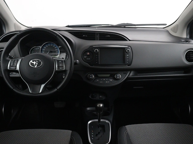 Met een gerust hart achteruitrijden? Dat kan, dankzij de achteruitrijcamera. Tot de standaard uitrusting van deze auto hoort ook electronic climate control. De audiobediening op het stuur zorgt dat muziek en informatie kunnen worden aangepast zonder het zicht op de weg te verliezen. Deze Toyota Yaris maakt het rijden graag gemakkelijk. Daarom verzorgt de regensensor de mate van ruitreiniging die de ruitenwissers moeten leveren bij neerslag. Je bent in deze Toyota ook voorzien van lederen stuur, isofix-aansluiting, centrale deurvergrendeling met afstandsbediening, boordcomputer en lederen versnellingspook.