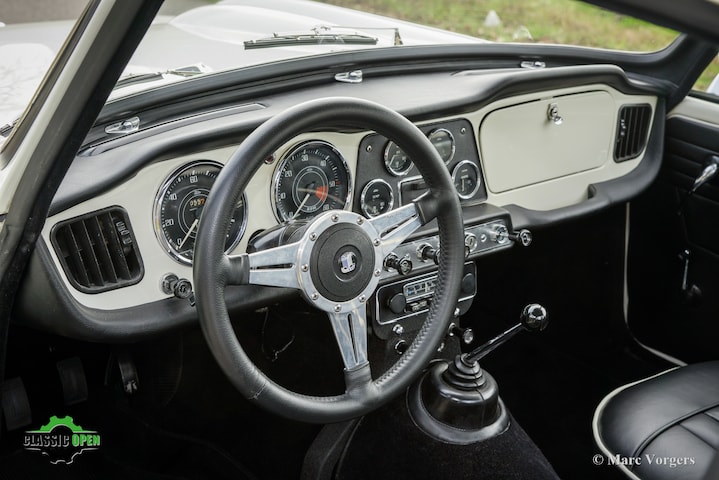 Deze schitterende Triumph TR4 toont prachtige originele details, zoals het vroege gespoten dashboard en de originele luchtfilters op de SU-carburateurs. Het originele stuurwiel ligt in de kofferbak, momenteel vervangen door een Moto-Lita sportstuur met lederen rand. De upgrades omvatten een aluminium radiator met hoge capaciteit en een roestvrijstalen uitlaatsysteem. Deze TR4 is voorzien van twee zeer gewilde opties uit die tijd.