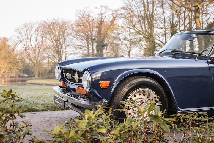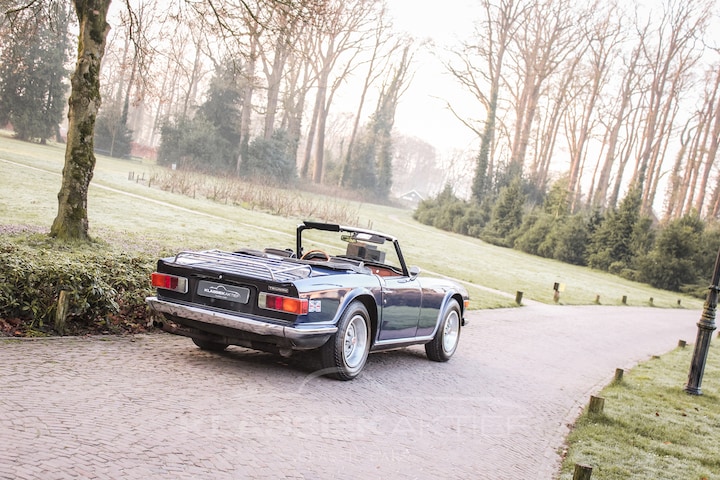 The Triumph TR6 is and remains an impressive sports car in several respects. This is not only due to the delightful inline six-cylinder engine with its impressive sound, but also because of the bold, Karmann-designed styling. The large wheels, direct steering, and beautiful sound make for a wonderful driver's car. The Triumph TR6 was produced from 1968 to 1976, including this Sapphire Blue Triumph TR6 produced in 1974. It is one of the last models in which the turn signals were mounted above the front bumper. In the final two years of production, the TR6 sat slightly higher on its wheels and the turn signals were placed below the front bumper.