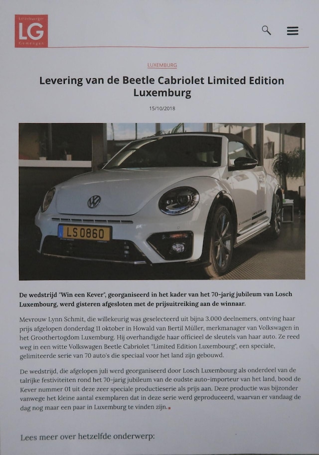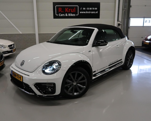 Limited Edition, van deze Beetle zijn er maar 70 geleverd wereldwijd. Dit is nummer 05/70. Kijk voor alle 83 foto's op onze website. Uniek mooie en zeer compleet uitgevoerde Vw Beetle cabrio met 150pk sterke 1.4 benzinemotor en automatische versnellingsbak DSG met 7 versnellingen en schakelmogelijkheid aan het stuur. Bouwjaar 2018 met zeer lage kilometerstand van 46.110 km. Natuurlijk is deze Beetle volledig dealer onderhouden, alle gegevens zijn aanwezig. Sportstoelen met zwart leer en stoelverwarming, xenon verlichting, 18 inch sportvelgen met 2 nieuwe banden, R-line, mistlampen, achteruitrijcamera, extra meters op het dashboard, app connect/android auto, bluetooth, cruise control, boordcomputer, enz.