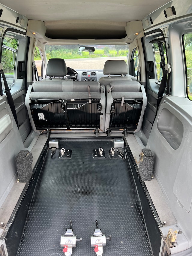 Keurige BENZINE Volkswagen Caddy rolstoelauto met verlaagde bodem aangeboden, deze auto is voorzien van een nieuwe APK en een volledige rolstoelaanpassing. Achterin heeft de rolstoelpassagier de mogelijkheid om met een elektrische gordels gemakkelijk in de auto te komen, voor de bevestiging aan de achterkant van de rolstoel zijn nieuwe moderne katrollen aanwezig!