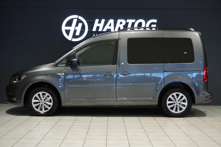Volkswagen Caddy, Origineel Nederlands (NAP), 5 zitplaatsen, achterbank binnen minimale handelingen of omhoog geklapt of volledig verwijdert, Getint glas achter, Trekhaak, Parkeersensoren achter, Climate control, Cruise control, Touchscreen infotainment met navigatie, Bluetooth audio + telefoon koppeling, Lichtmetalen velgen, Automatisch dimlicht,