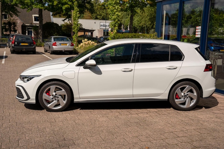 Super sportieve Volkswagen Golf GTE plug in hybride met navigatie, rode remklauwen, privacy glass en parkeersensoren rondom.