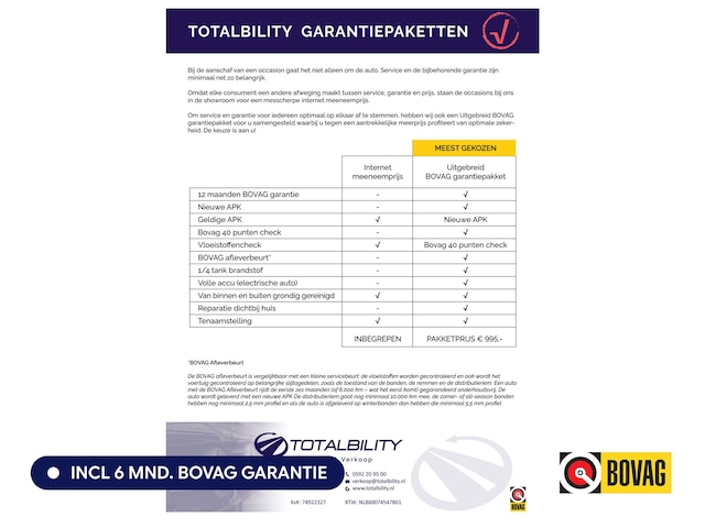 Wilt u nóg meer gemoedsrust? Dan kunt u kiezen voor de uitgebreide 12 maanden BOVAG-garantie. Voor een meerprijs van € 595,- verlengt u uw garantieperiode naar een volledig jaar. Ideaal voor wie maximale zekerheid wil over onderhoud, reparaties en betrouwbaarheid.