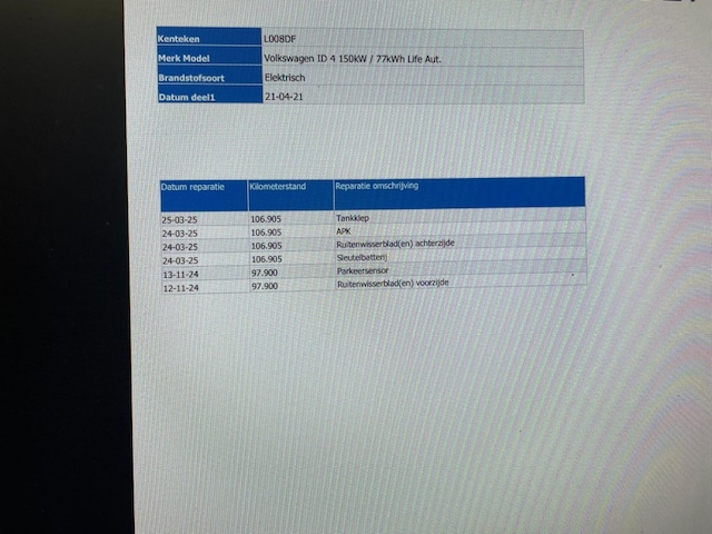 Te koop: Volkswagen ID.4 Life 77 kWh in prachtig blauw Deze Volkswagen ID.4 is een SUV met een krachtige uitstraling en een comfortabel interieur. Met zijn elektrische aandrijving en automatische transmissie is het een ideale auto voor zowel korte ritjes in de stad als lange afstanden op de snelweg. Het bouwjaar van deze auto is 2021 en de kilometerstand bedraagt 128194. De auto is voorzien van alle moderne gemakken en is 100% dealeronderhouden. Met de BOVAG garantie kunt u zorgeloos op weg. Deze Volkswagen ID.4 is uitgerust met LED-koplampen voor een heldere verlichting en een modern uiterlijk. Daarnaast is de auto voorzien van park control voor en achter, wat het parkeren en manoeuvreren een stuk eenvoudiger maakt. De stoelen zijn voorzien van verwarming, zodat u ook op koude dagen comfortabel kunt rijden. Daarnaast beschikt de auto over cruise control, stuurverwarming en radio DAB voor een geweldige rijervaring. Met de Apple CarPlay functie kunt u gemakkelijk uw iPhone koppelen en gebruik maken van diverse apps en functionaliteiten. De airconditioning is automatisch geregeld, waardoor u altijd van een aangename temperatuur kunt genieten. De bijzonderheden van deze Volkswagen ID.4 zijn onder andere de Carplay functie, waarmee u eenvoudig verbinding kunt maken met uw iPhone. Daarnaast zorgen de stoelverwarming en cruise control voor extra comfort en gemak tijdens het rijden. Kortom, deze Volkswagen ID.4 Life 77 kWh is een ideale elektrische SUV met alle moderne gemakken en een sportief uiterlijk. Met zijn krachtige prestaties en ruime interieur is het de perfecte auto voor zowel zakelijk als privé gebruik. Bent u op zoek naar een betrouwbare en comfortabele auto? Kom dan snel langs voor een proefrit en ervaar zelf de kwaliteiten van deze prachtige Volkswagen ID.4.
