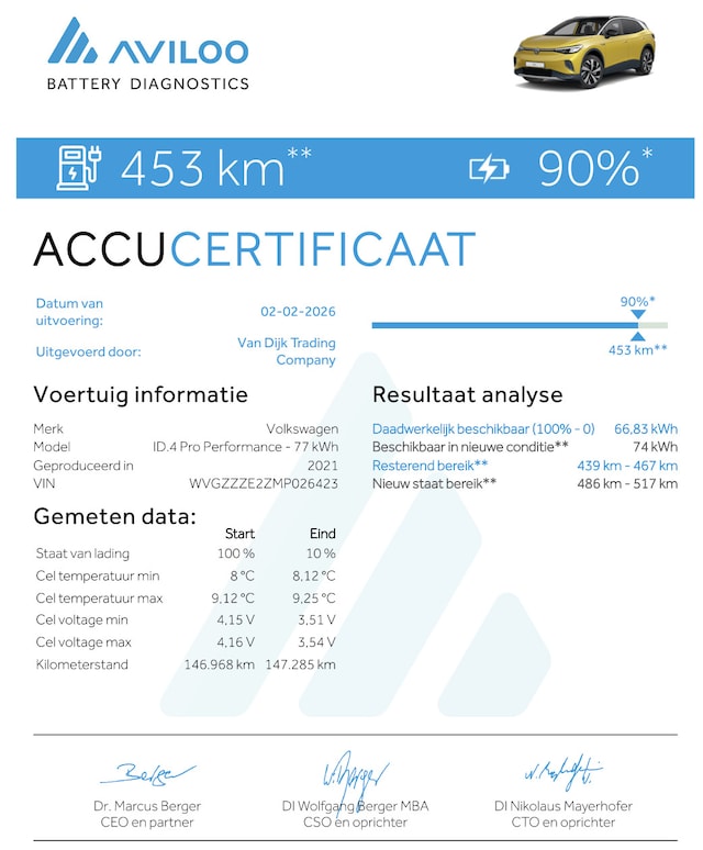 ✓ Premium Aviloo rijtest (100% naar 10%) op basis daarvan 90% SOH (state of health)