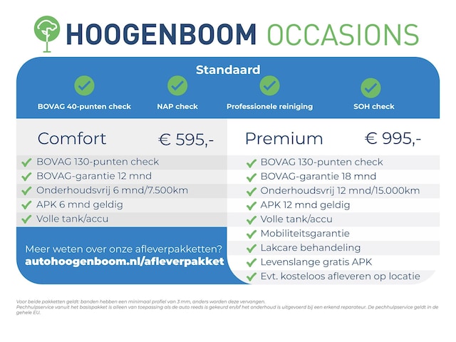 - Hoogenboom Comfort EV (€ 595 meerprijs): Dit afleverpakket bevat (in plaats van afleverpakket "Hoogenboom Basis"): BOVAG garantie (12 maanden); APK 6 maanden geldig, BOVAG 130-punten check, Landelijke garantiedekking bij merkdealer, Nationale Auto Pas check, Onderhoudsvrij 6 maanden/7.500km, Professionele reiniging, SOH check (Plug-in Hybride & EV), Volle tank en/of volle accu