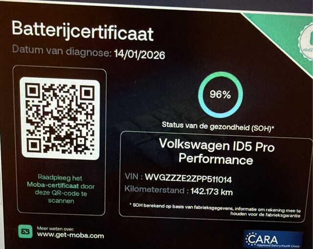 Duurzaam en dynamisch, de Volkswagen ID.5 verenigt deze twee uitersten in zich. Dit is een auto uit 2022, er staat 142175 kilometer op de teller. Met de elektromotor rijdt u stil en snel de toekomst in. Maar ook schoon en zuinig. Een belangrijke eigenschap van iedere Volkswagen is zijn duurzaamheid. Dat ziet u ook aan deze ID.5. Het is een goed onderhouden auto, de onderhoudshistorie is bekend. De krachtige motor geeft deze Volkswagen uitstekende prestaties. De verwarmbare voorstoelen zijn een weldaad voor rug en schouders. De elektrisch bedienbare achterklep opent met een druk op de knop. Het glazen panoramadak laat u genieten van een wijds uitzicht en meer lichtinval. De slimme koplampen gebruiken de allernieuwste matrix LED-verlichting. Altijd maximaal zicht, nooit verblinding bij de tegenligger. Verder is de Volkswagen uitgerust met: 21 inch lichtmetalen velgen, warmtewerend glas, in delen neerklapbare achterbank, LED-achterlichten en snelheidsafhankelijke stuurbekrachtiging.
