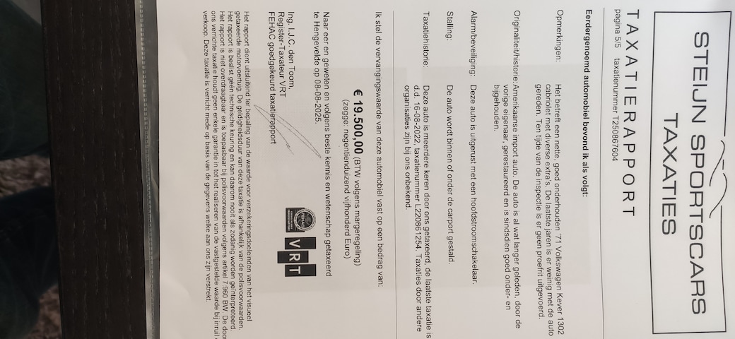 Prachtige en zeer goed rijdende Kever Cabriolet., Altijd zeer goed onderhouden zoals aan de gehele auto te merken en te zien is., De kwaliteit blijkt ook het aanwezige recente (08-08-2025) taxatierapport t.w.v. €19.500, Bodem beschermt en jaarlijks gecontroleerd., Opvallend leuke verschijning die altijd vele positieve reacties oproept., Uiteraard met het voor de oer kevers kenmerkende fluitje uit de uitlaat, dus niet met de roffel die uit de injectie uitvoeringen komt. Volgens de echte fanaten zijn alleen de kevers met het fluitje de echte kevers., Prima mogelijkheid voor iemand die een echte oer kever zoekt en daar nog jaren van wil/kan genieten., dus een goede investering die naar alle waarschijnlijkheid zijn waarde zal behouden., Bel of mail voor verdere info en/of afspraak.