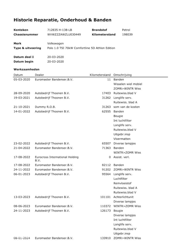 - Onderhoudshistorie aanwezig: Ja