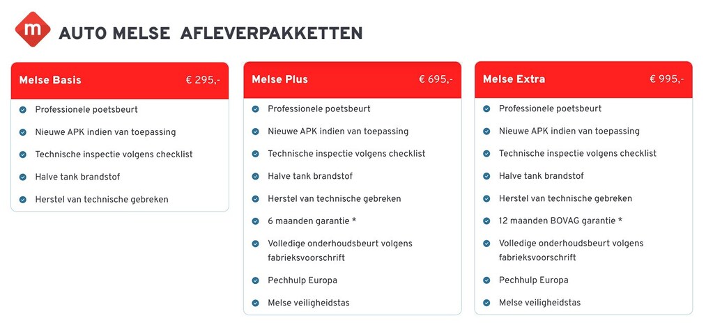 - Melse Extra (BOVAG) (€ 995): Het afleverpakket Extra omvat een volledige onderhoudsbeurt volgens het fabrieksonderhoudsschema en een nieuwe APK-keuring. Bovendien krijgt u 12 maanden BOVAG- garantie, Pechhulp Europa, een volledige poetsbeurt en brandstof tussen 1/4 en 1/2 tank.