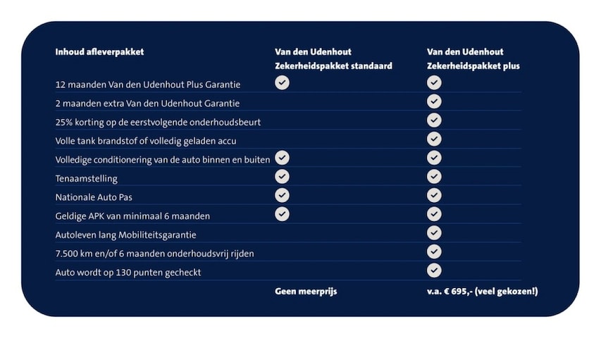 Kies voor extra zekerheid en koop jouw occasion in combinatie met het Van den Udenhout Zekerheidspakket Plus. Met het Van den Udenhout Zekerheidspakket Plus profiteer je onder andere van 14 maanden VDU Plus Garantie, gratis APK, gratis seizoensopslag van banden, een autoleven lang Pechhulp* en daarnaast nog veel meer voordelen! Het Van den Udenhout Zekerheidspakket Plus betekent dus zorgeloos autorijden in je nieuwe occasion. De extra zekerheid van het Van den Udenhout Zekerheidspakket Plus is er al vanaf € 495,-.