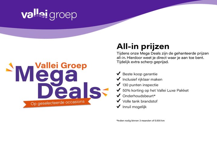 Vallei Groep is de officiële Volkswagen, Audi, SEAT, Škoda en Volkswagen Bedrijfswagens dealer met vestigingen in Arnhem, Duiven, Nijmegen, Velp, Veenendaal en Ede. De geadverteerde verkoopprijs is inclusief kosten rijklaar maken. Informeer bij onze verkoopadviseurs naar de optionele Vallei Groep afleverpakketten.