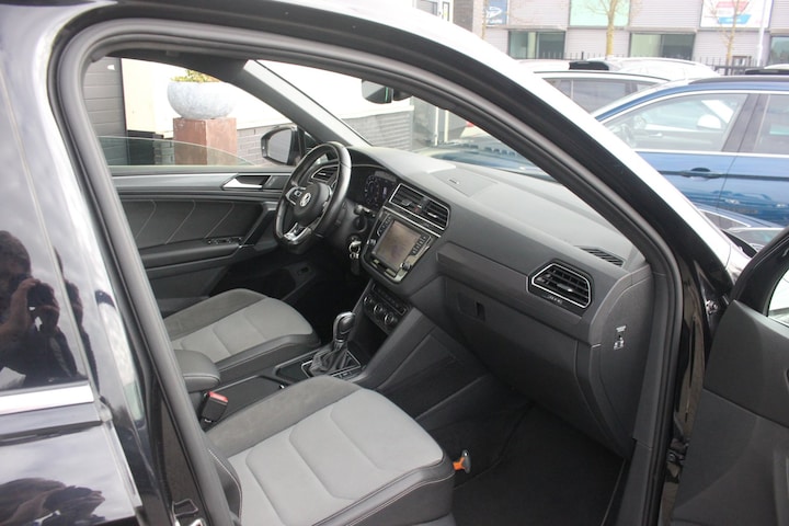 De Tiguan is geleverd in prachtig Deep black perleffekt metallic lakwerk over de 19 inch lichtmetalen velgen, afgemaakt met het R-Line sportstuurwiel en de R-Line half lederen/alcantara sportstoelen.