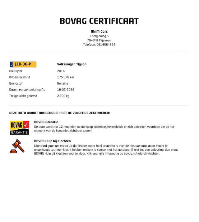 Dit afleverpakket bevat: BOVAG garantie (12 maanden); 12 maanden BOVAG garantie