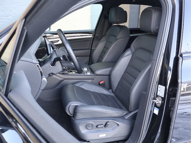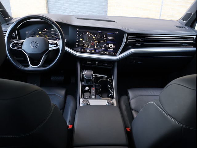 Het exterieur is uitgevoerd in Deep Black metallic en gecombineerd met het R-Line Exterior Black Style pakket. Zwarte accenten, imposante 21 inch R-Line velgen en de strakke lijnen geven de Touareg een krachtige, bijna ingetogen uitstraling. Geen schreeuwerige details, maar precies de juiste balans tussen sportief en stijlvol.
