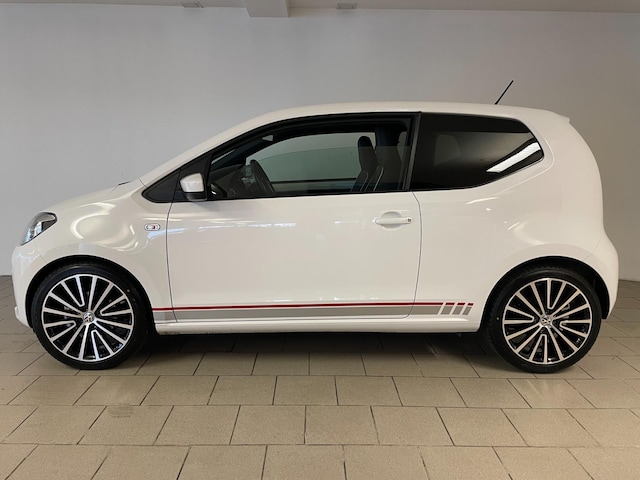 Volkswagen High Up 75pk! Wauw! Wat een uitstraling heeft deze High Up! De witte lak, de striping, de 17 inch Polygon velgen, zwart lederen interieur, zwarte dakhemel! Dat zorgt voor de prachtige uitstraling van deze sportieve Up!