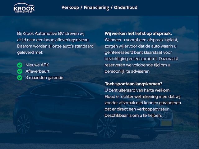 Wilt u uw nieuwe auto financieren? Ook dat is mogelijk bij Auto Krook. Neem vrijblijvend contact op met één van onze medewerkers of ga naar Autokrook.nl/diensten/financiering voor meer informatie.