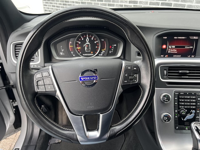 Deze Volvo V60 is 'connected'. Belangrijke functies worden permanent gemeten en zijn uit te lezen via een speciale app, ook op afstand. Laat u onderweg niet afleiden, de bediening van het audio-installatiesysteem en ook het navigatiesysteem met harde schijf gaat met knoppen op het stuur en met spraak. De achteropkomend verkeer waarschuwing bewaakt de afstand tot achterliggers en geeft een signaal als er te weinig ruimte is. De electronic climate control zorgt voor een behaaglijk klimaat in de auto. Parkeersensoren helpen u tijdens het in- en uitparkeren. Deze Volvo is voorzien van regensensor, cruise control, dvd-systeem, automatisch dimmende buitenspiegels, lederen stuur en versnellingspook en centrale deurvergrendeling met afstandsbediening.