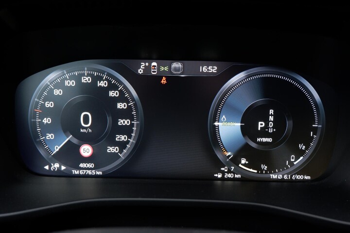 Pragmatisch en veilig als deze auto is, beschikt hij over diverse veiligheidssystemen. Tijdens de rit hebt u altijd een bijrijder, want de verkeersbord-detectie leest de borden langs de weg en projecteert ze voor u op het instrumentarium. Het Lane-keeping systeem let constant op en waarschuwt of corrigeert als u onoplettend over de lijnen van de rijstrook gaat. Deze auto heeft actieve dodehoekdetectie. Dit veiligheidssysteem helpt u om aanrijdingen te voorkomen. In deze Volvo vinden we verder een forward collision warning system, hill hold functie, brake assist, vermoeidheidsherkenning en bandenspanningcontrolesysteem.
