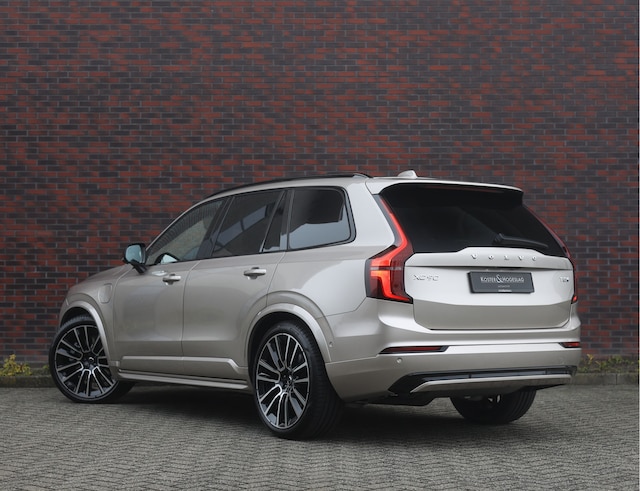 Deze XC90 is bijzonder fraai uitgevoerd in Bright Dusk metallic, een zilveren kleur die in het juiste licht een prachtige beige gloed heeft. Als Ultra Dark zijn alle exterieuraccenten eveneens uitgevoerd in hoogglans zwart, wat samen met de 22” velgen en getinte achterruiten zorgt voor een prachtige uitstraling.